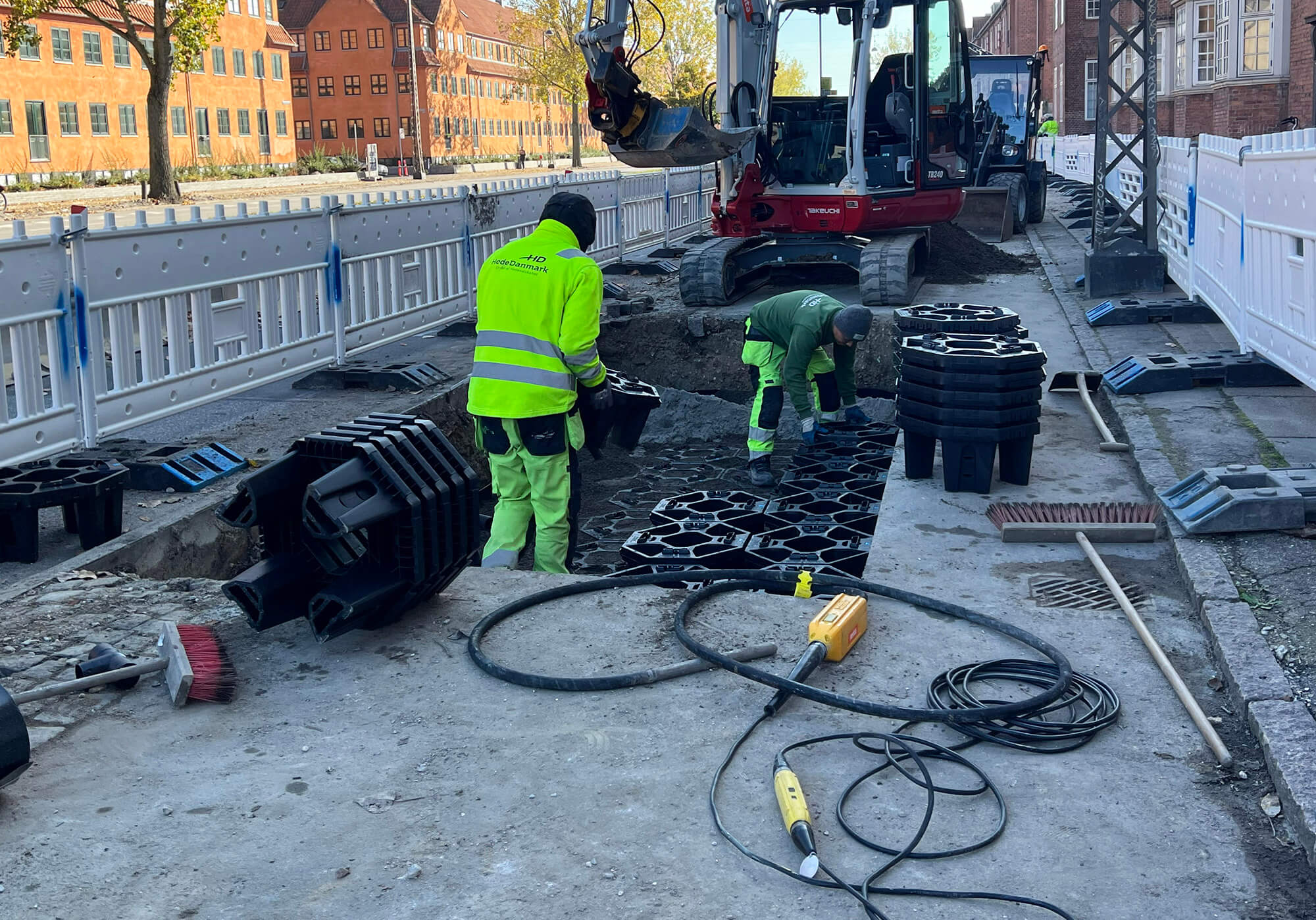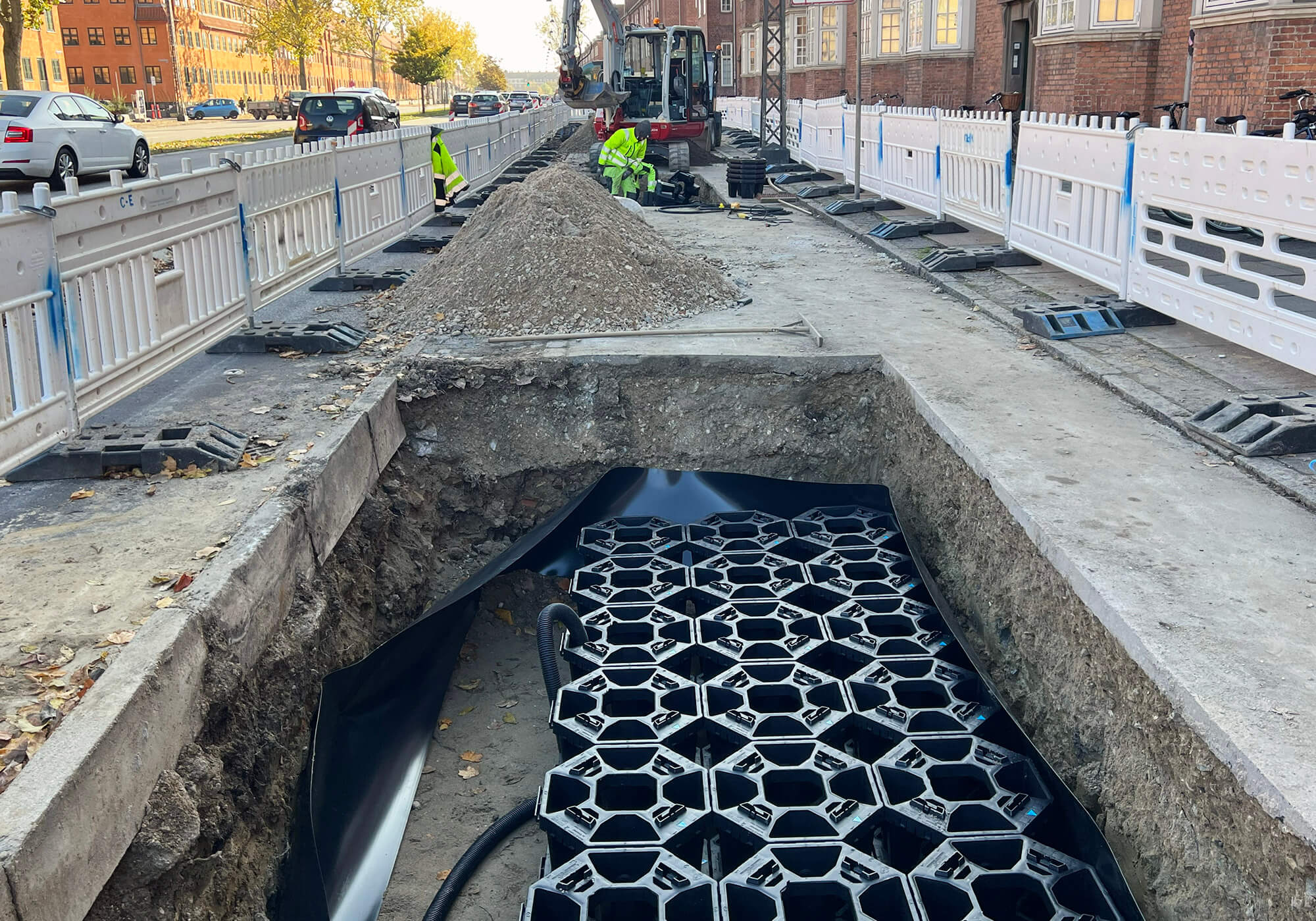 Systemet produseres av 100% resirkulert plast og er enkelt å installere. Samtidig kan det tåle svært høye belastninger, noe som gjør det ideelt for byrom som Borups Allé, hvor plantehullene strekker seg langt inn under sykkelstien.