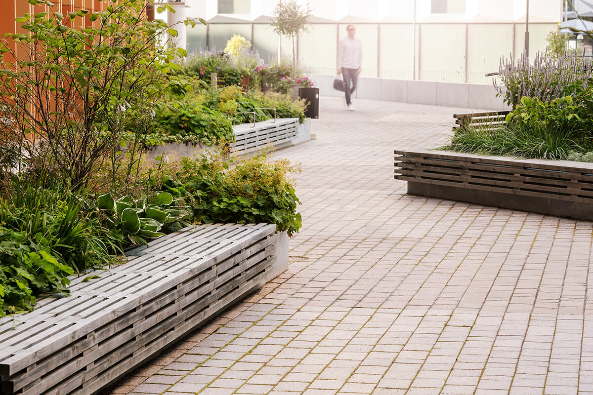 Også her bidro Milford med sitt Contrast Freestyle-system, som danner grunnlaget for alle stålkantløsninger og en rekke spesialdesignede trebenker. Sammen binder disse elementene uterommene til byggets arkitektoniske formspråk.