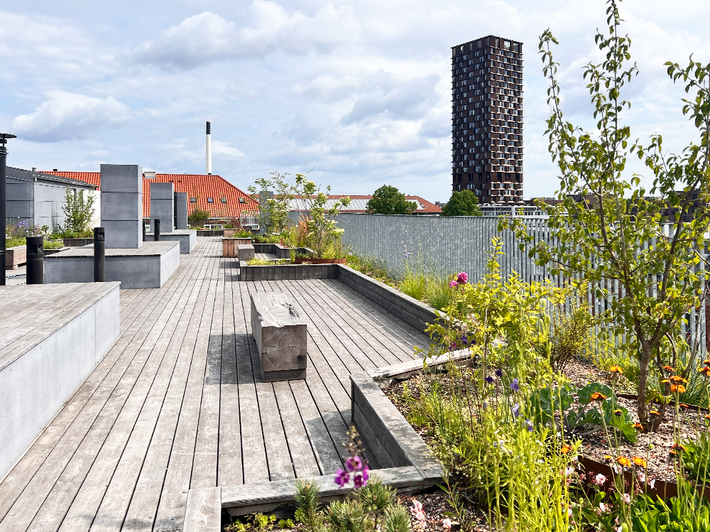 I Københavns nordvestkvarter er en takterrasse i fjerde etasje blitt forvandlet fra en bar og grå flate til en grønn oase for de unge beboerne. Å skape frodige oppholdsrom i høyden stiller særlige krav til både vekt, vann og vind. Her har hevede plantekasser i flere nivåer gitt riktige vekstforhold for en variert beplantning, mens kreative wiresystemer gir klatreplanter mulighet til å bre seg og danne en grønn bakgrunn for terrassen.