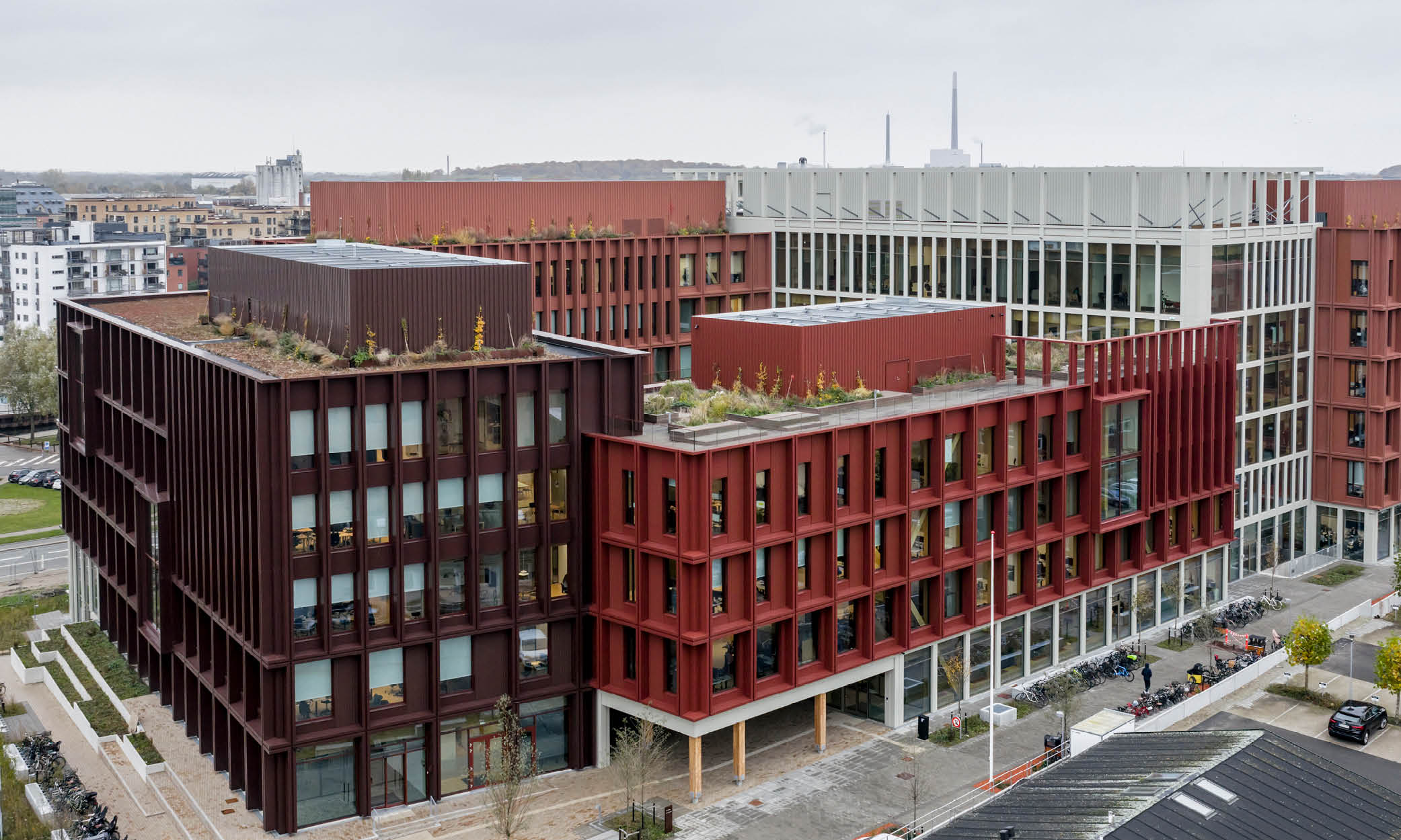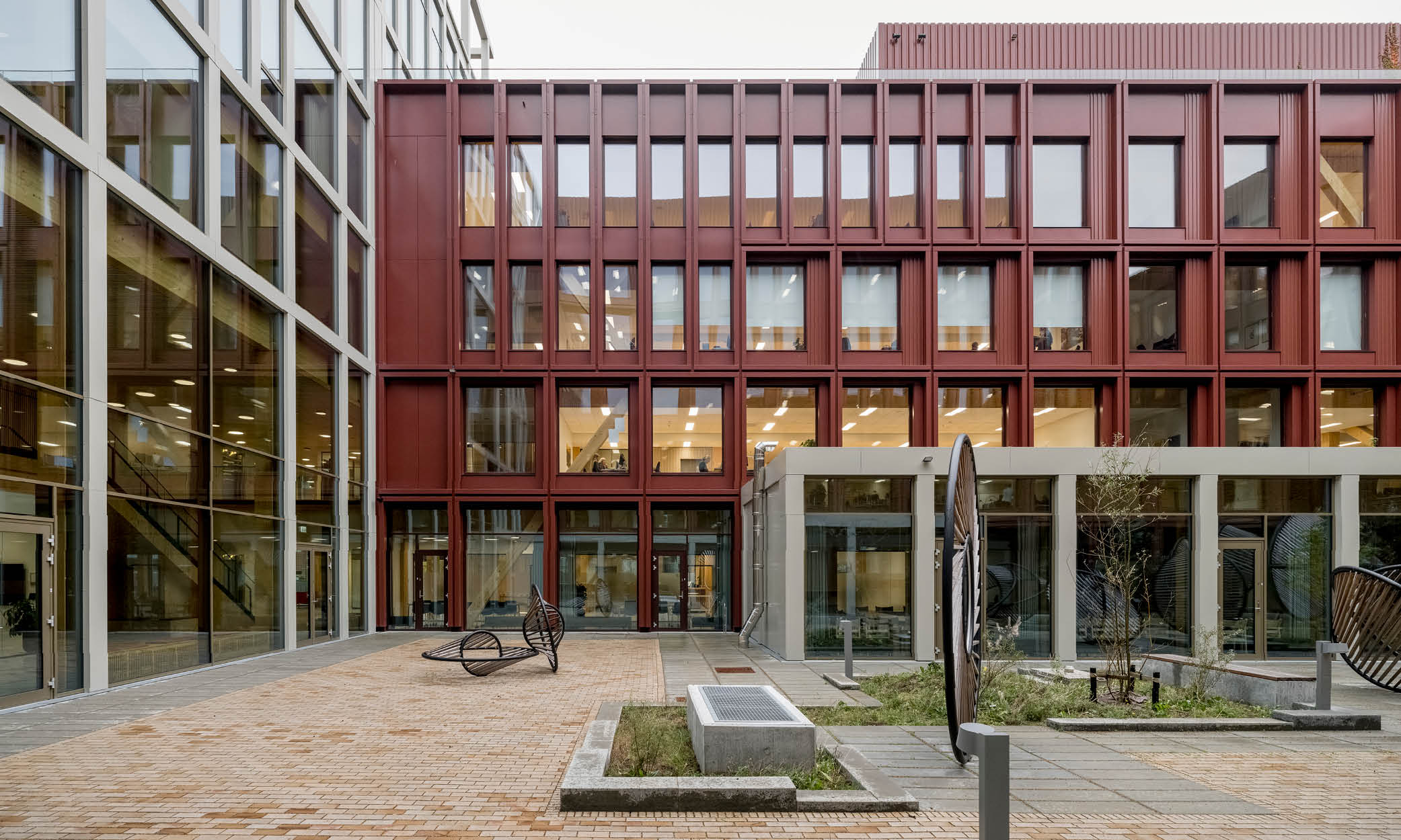 Fasadene er utført i resirkulert aluminium, og derødbrunlige nyansene spiller fint opp mot nabobyggenes klassiske murstein.